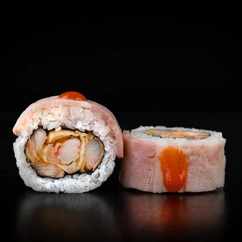 Нори, рис, креветка темпура, капуста кимчи, бекон.