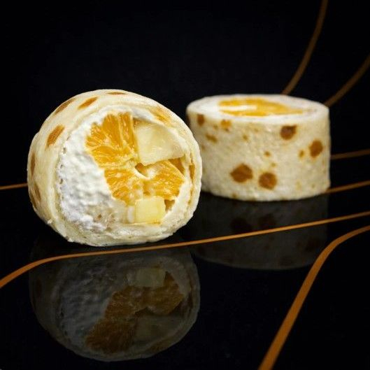 Сладкий блинчик с ванилью и сахаром, сливочный сыр с ванилью и сахарной пудрой, банан, апельсин.