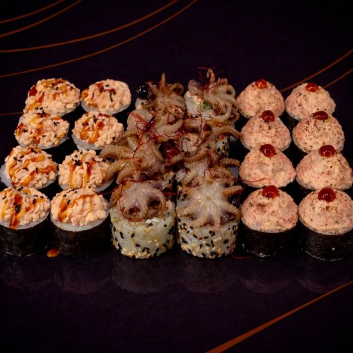 Заказать Ролл с лососем и осьминожкой, ролл с мидиями и икорной шапкой, Татаки с кальмаром, васаби, имбирь, соус соевый.