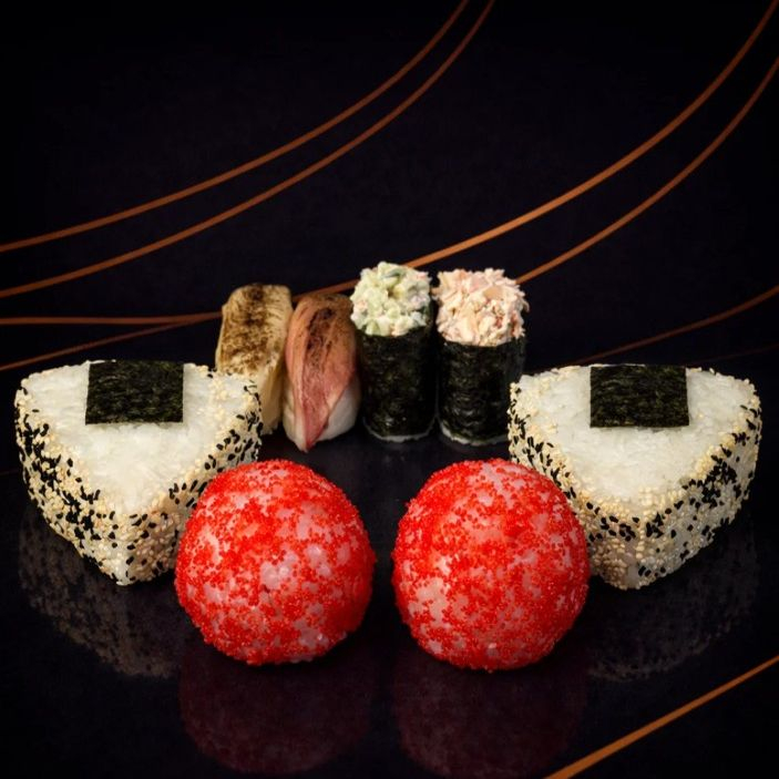 Заказать Темари с жареным лососем, Темари с жареным тунцом, Онигири с креветкой, Онигири с шиитаке, Нигири с опаленным тунцом, Нигири с опаленным окунем, Гункан с крабом, васаби, имбирь, соус соевый.