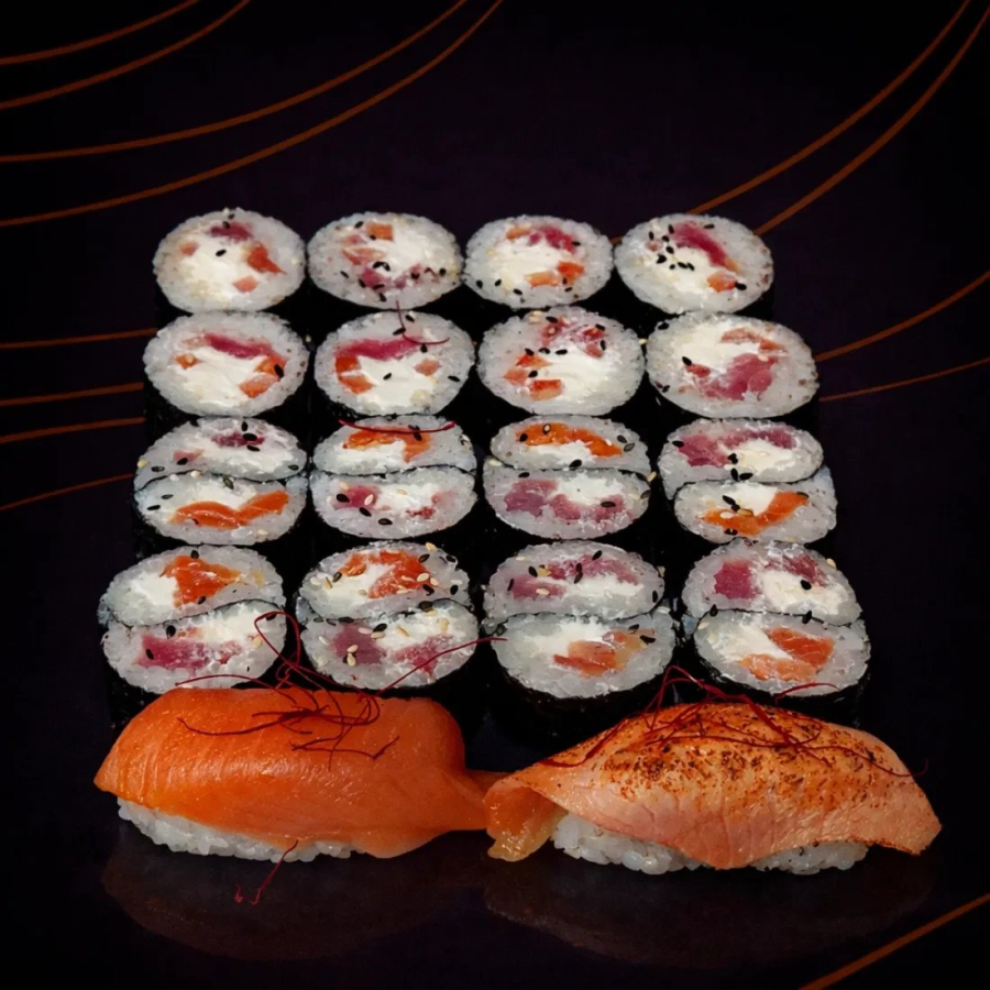 Роллы Инь-Янь с лососем и тунцом, футомак с тунцом и свежим томатом, нигири с копчёным лососем.