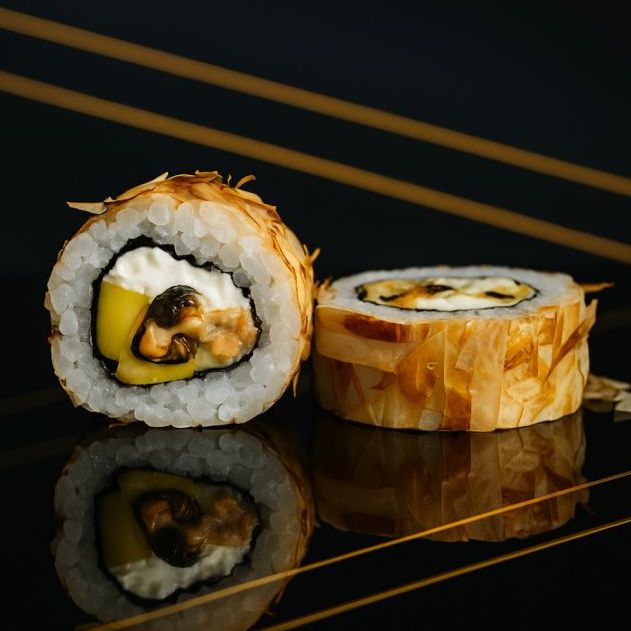 Мидии, сливочный сыр, такуан, стружка тунца.