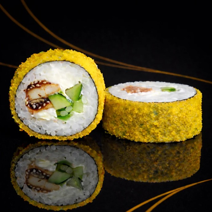 Рис, сливочный сыр, угорь, огурец, темпура.