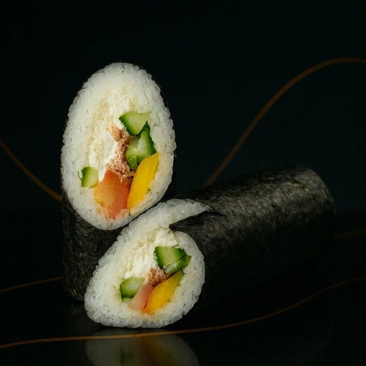 Заказать Жареный тунец, сливочный сыр, такуан, огурец, томат, болгарский перец, капуста.