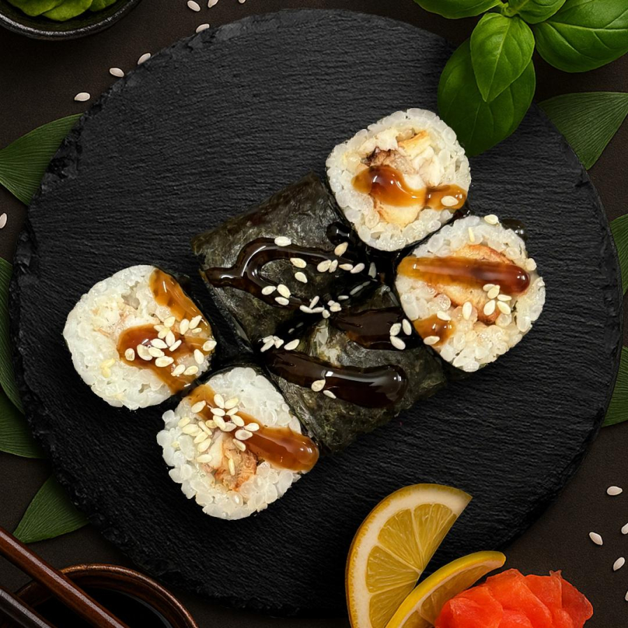 Рис, нори, угорь, кунжут, соус терияки.