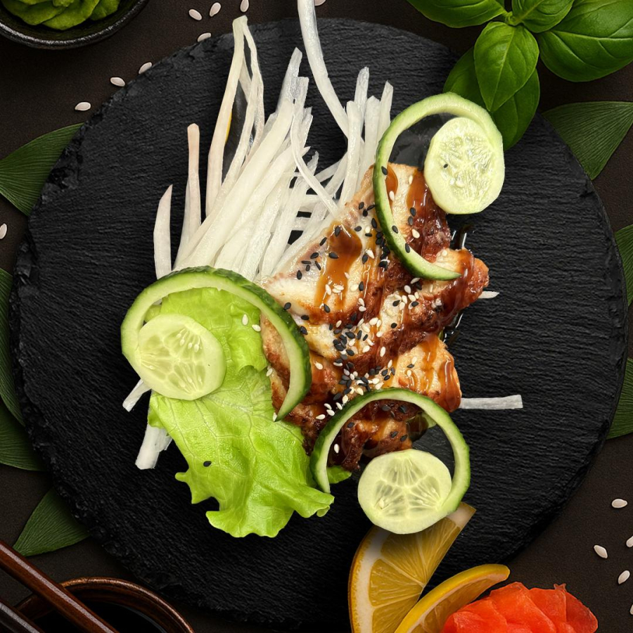 Дайкон, угорь, огурец, соус терияки, кунжут.