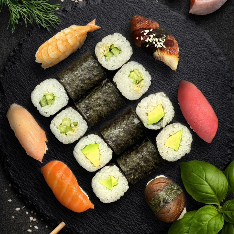 Нигири с лососем, Нигири с угрём, Нигири с тунцом, Нигири с окунем, Нигири с креветкой, с шиитаке, Хососмаки с огурцом, Хосомаки с авокадо.