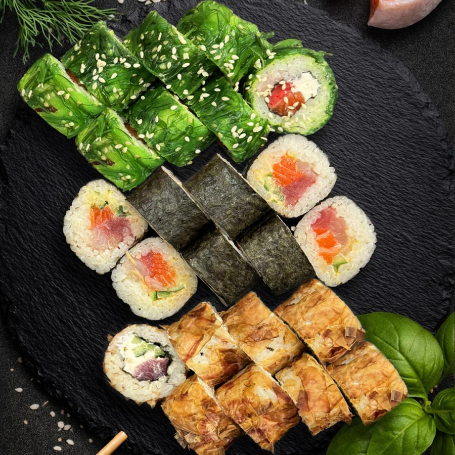 Нигири с лососем, Нигири с угрём, Нигири с тунцом, Нигири с окунем, Нигири с креветкой, с шиитаке, Хососмаки с огурцом, Хосомаки с авокадо.