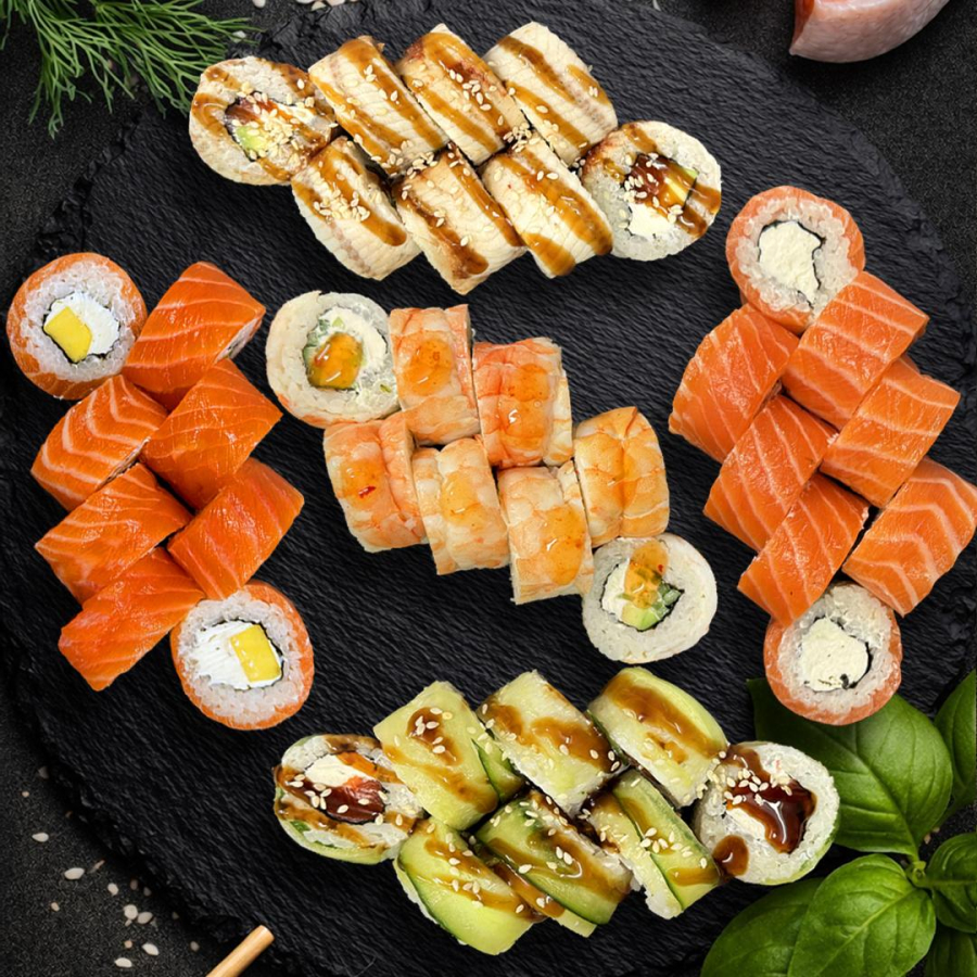 Футо маки, Динамит, Хосомаки с лосоем, Хосомаки с креветкой, Нигири с лосоем 2шт.