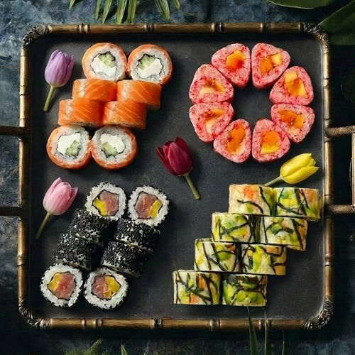 Заказать Ролл тар-тар с авокадо и креветками, ролл с тунцом и такуаном, ролл в рисовой бумаге с креветкой, Филадельфия с огурцом.