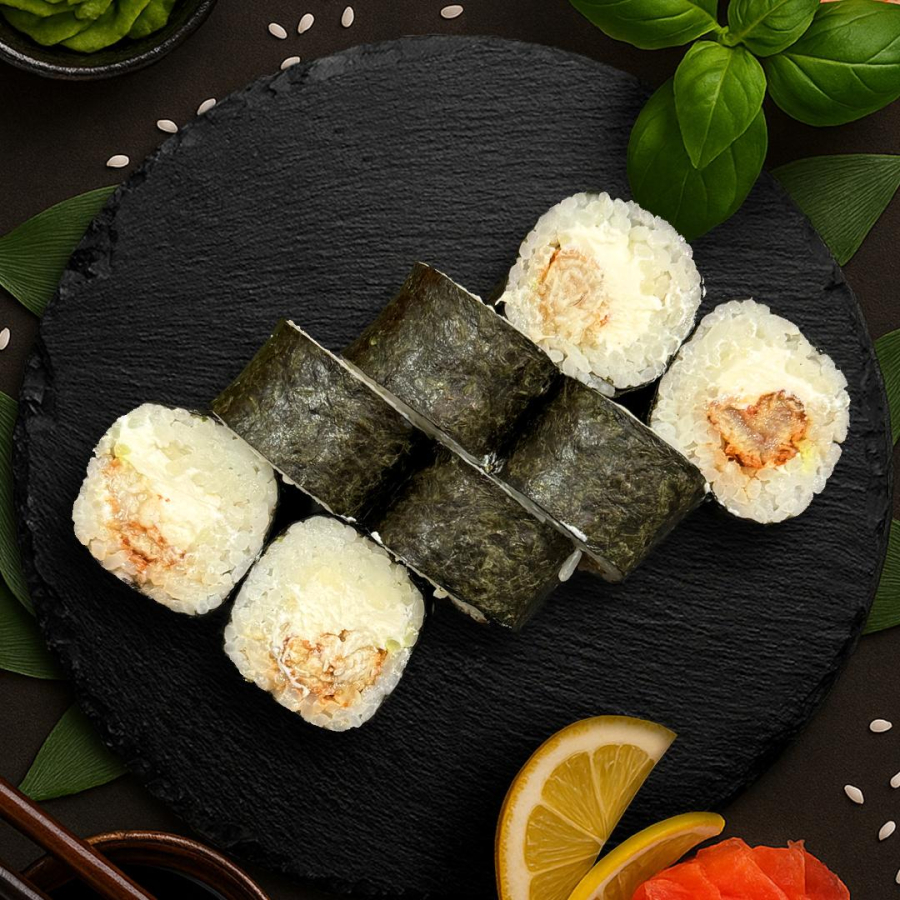Рис, нори, сыр сливочный, угорь.