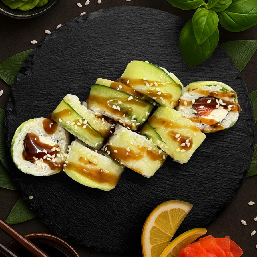 Рис, нори, сыр сливочный, имбирь марин., сёмга с/с, водоросли чука, кунжут.