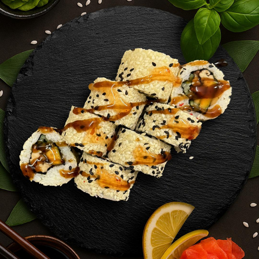 Рис, нори, сыр сливочный, авокадо, лосось с/с, угорь, соус терияки, кунжут.