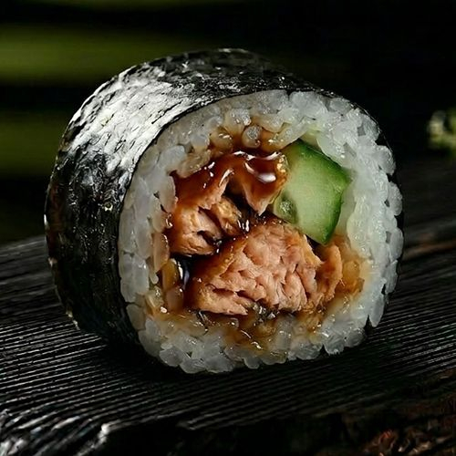 Рис, лосось терияки, огурец, нори.