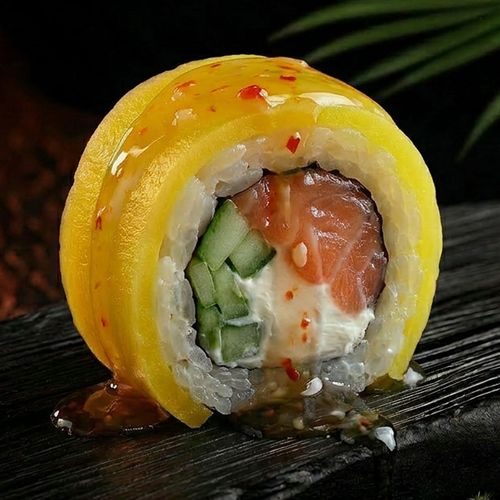 Заказать Рис, сёмга с/с, креветка, такуан, авокадо, сыр кремчиз, соус чили сладкий, нори.