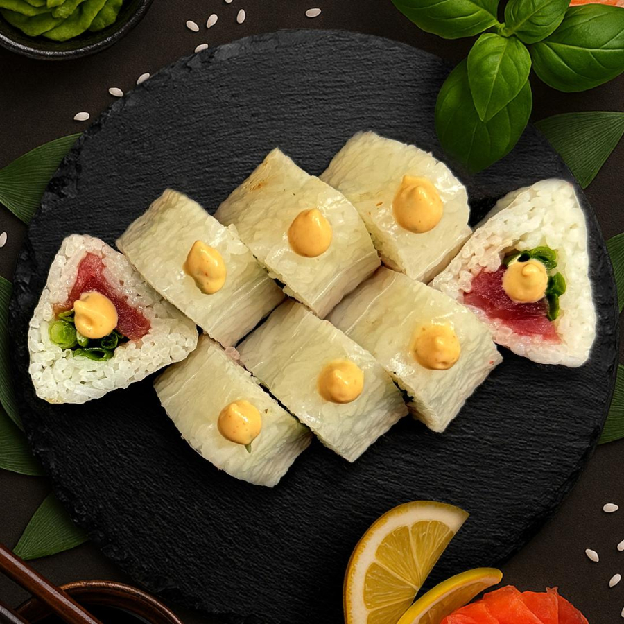 Заказать Рис, рисовая бумага, тунец, лук зеленый, соус спайси.