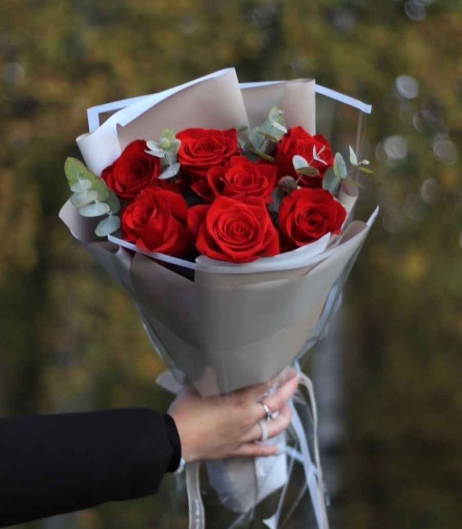 7 шт. роз, 2 шт. веточки эвкалипта, декоративная упаковка.