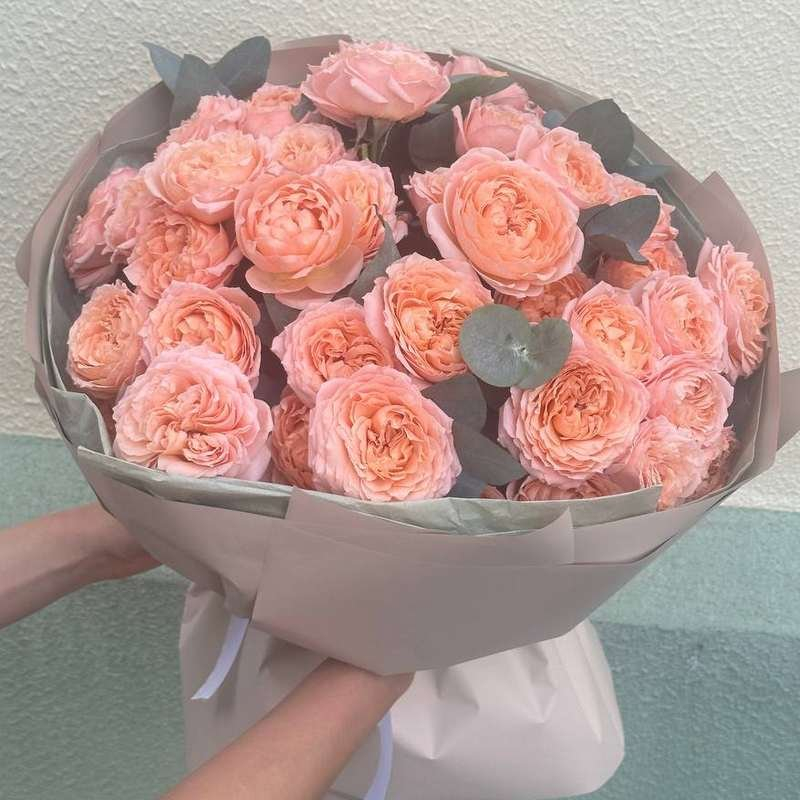 9 шт. кустовой розы, 4 шт. эвкалипта, декоративная упаковка.