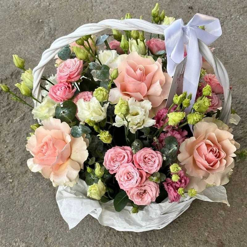 Заказать 5 шт. французских роз, 5 шт. эустом, 5 шт. кустовых роз, 3 шт. эвкалипта, корзина.