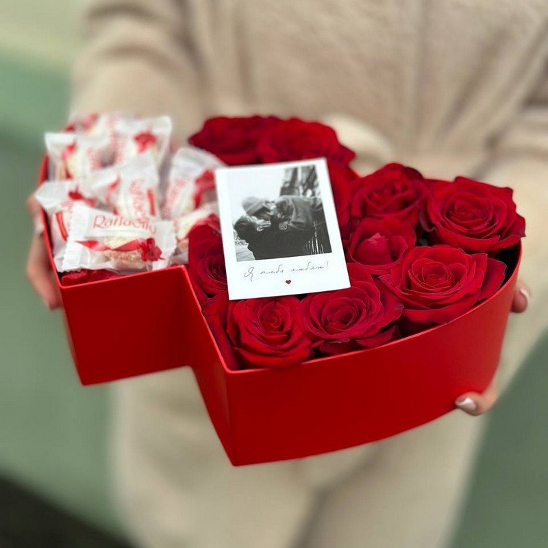 11 шт. роз, рафаэлло, коробка сердце, оазис.