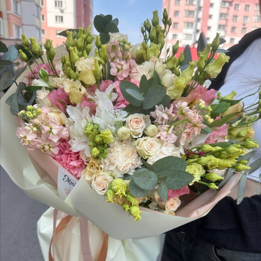 Эустома, диантусы, альстромерии, кустовые розы, маттиола, эвкалипт.