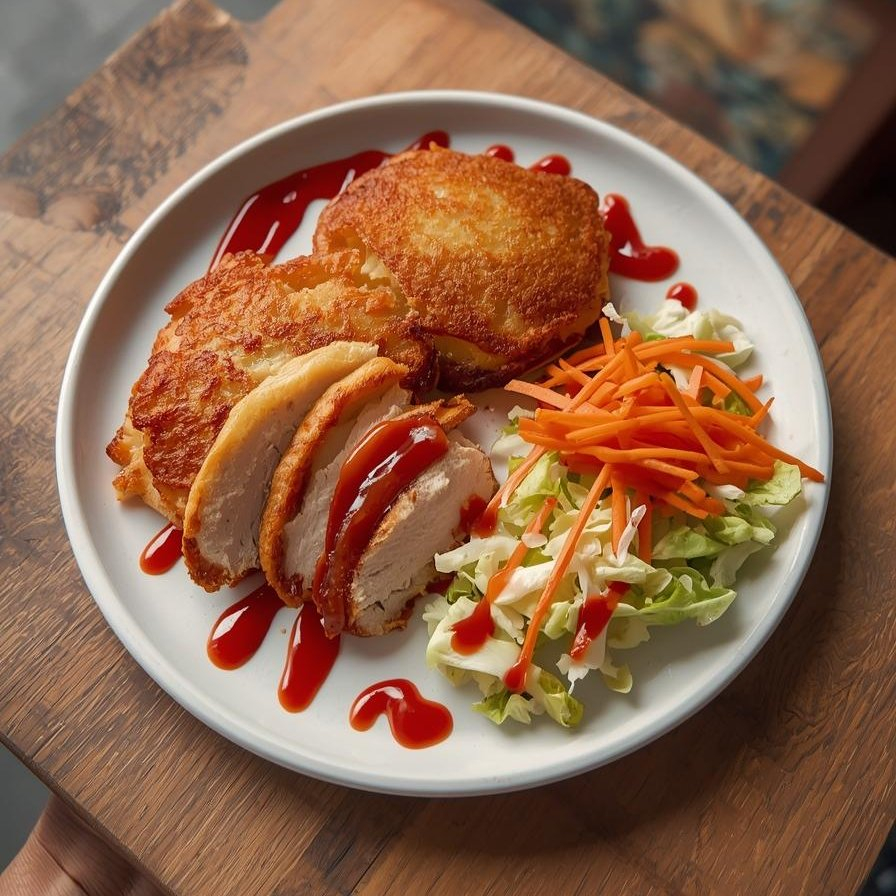 Драники 2шт + мясо курицы-гриль + салат + кетчуп.