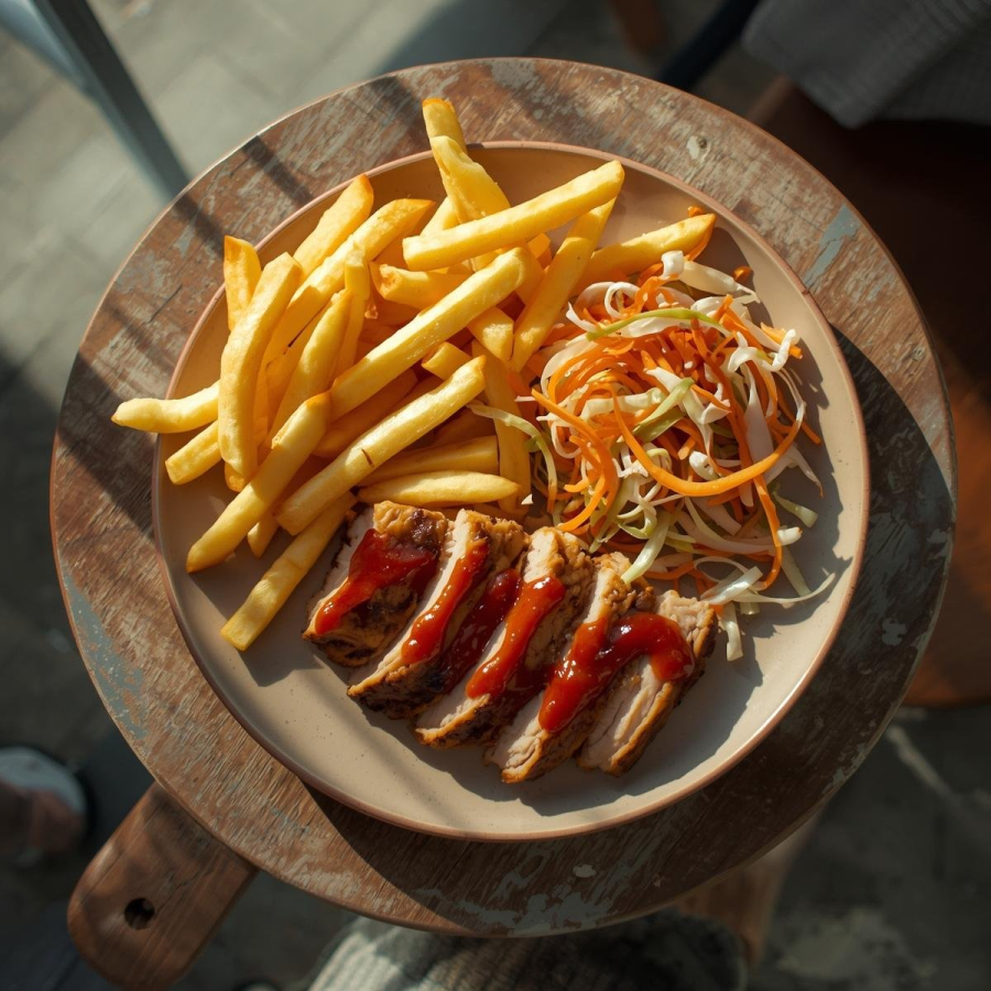 Картофель фри + мясо курицы-гриль + салат + кетчуп.