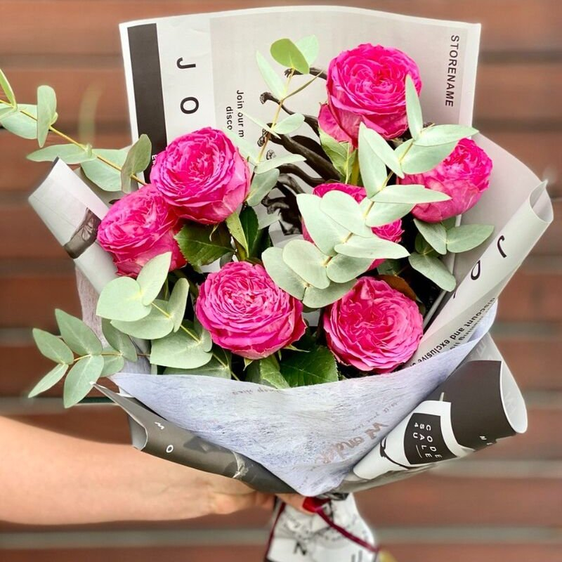 Состав букета: Кустовая роза Твистер, Лилия, Тюльпан, Фисташка, Эвкалипт. Длина 35см, высота 55см.