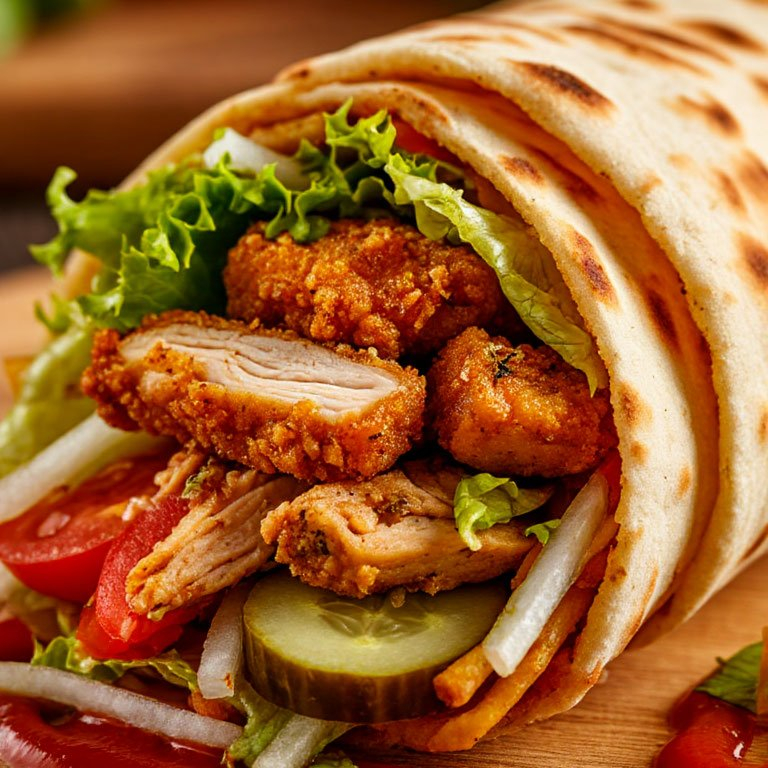 Лаваш, фирменный соус, куриное мясо, маринованный огурец, свежий помидор.