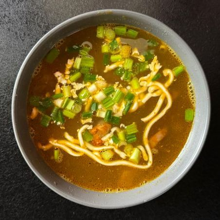 Куриный бульон, курица, рисовая лапша, ростки сои.