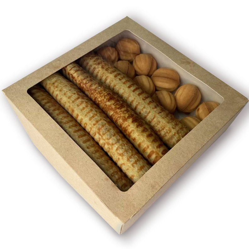 Хрустящие орешки (14шт.) и вафельные трубочки (8шт.), наполненные ароматной сгущенкой, дарят вкус детства. Срок изготовления 2-3 дня при заказе до 12 часов в будние дни.