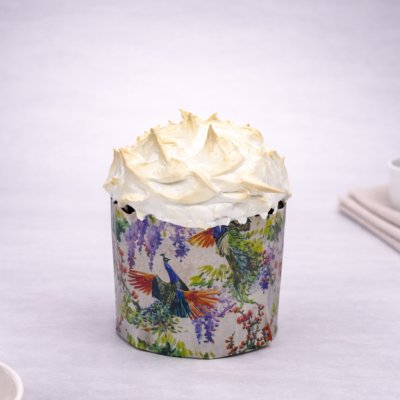 Кекс на основе муки, сахара, яиц, растительного масла с добавлением шоколадных дропсов. Поверхность украшена обоженной меренгой(обожженным белковым кремом).