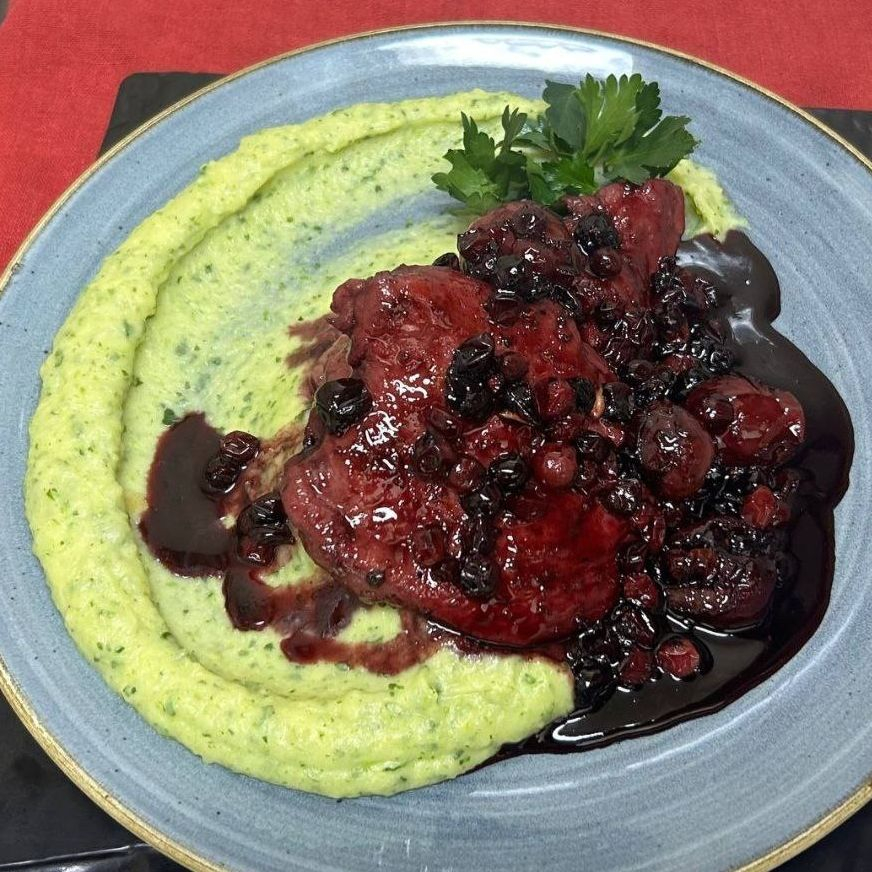 Филе индейки жареное на гриле, доводится до готовности в клюквенном соусе и продаётся с картофельно-шпинатным пюре.