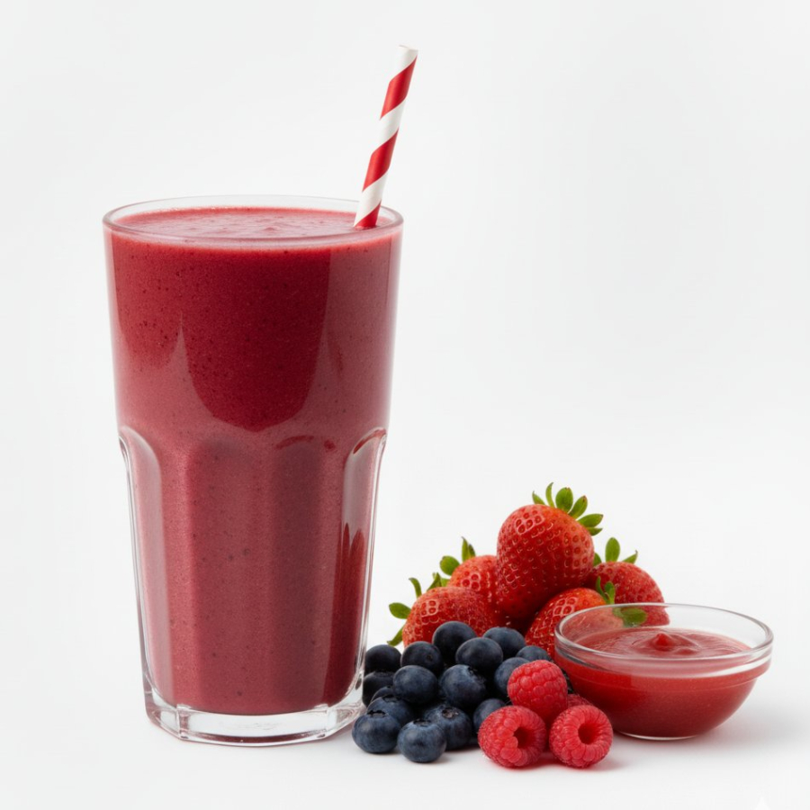 Банан, клубничное пюре (натуральное), черника, малина, лед, сахарный сироп.