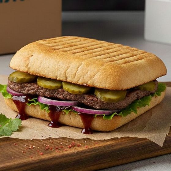 Чиабатта, майонез, салат, маринованный огурец, говядина, красный лук, соус BBQ.