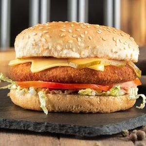 Заказать Булочка, курица, пекинская капуста, маринованные огурцы, помидоры, сыр тостовый, кетчуп, чесночный соус.