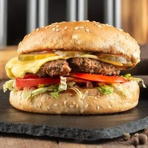 Заказать Булочка, говядина, пекинская капуста, маринованные огурцы, помидоры, сыр тостовый, кетчуп, чесночный соус.