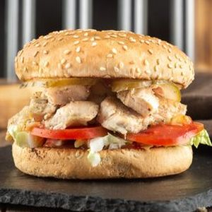 Заказать Булочка, куриное филе, пекинская капуста, маринованные огурцы, помидоры, чесночный соус.