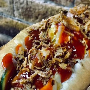 Заказать Булочка датская, сосиска, чесночный соус, соус барбекю, огурцы, помидоры, морковь по-корейски, лук фри.