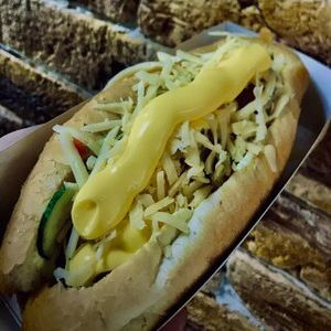 Заказать Булочка датская, сосиска, чесночный соус, соус барбекю, огурцы, помидоры, морковь по-корейски, лук фри.