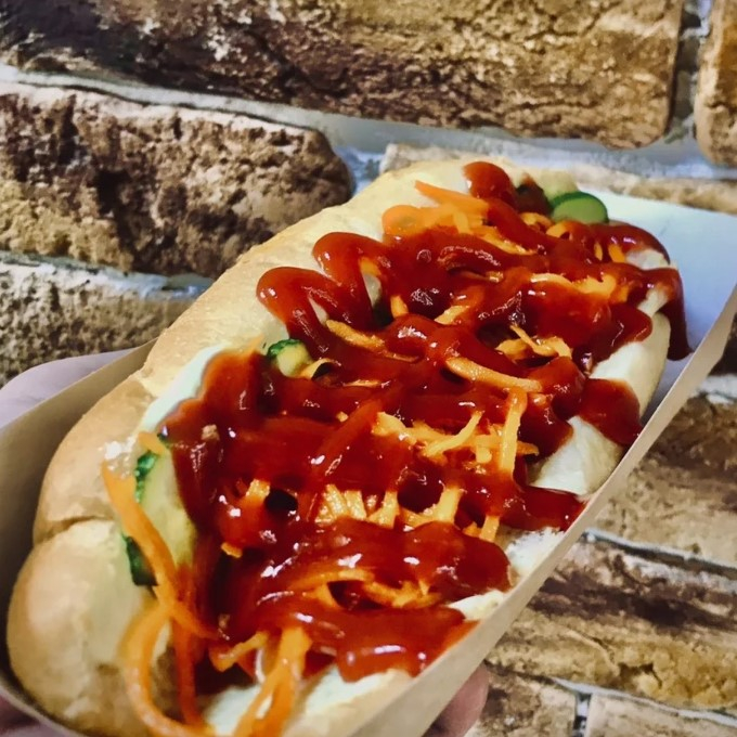 Заказать Булочка датская, сосиска, чесночный соус, соус барбекю, огурцы, помидоры, морковь по-корейски, лук фри.