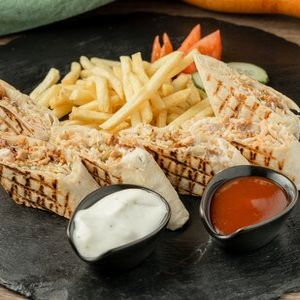 Заказать Шаурма стандарт, разрезанная на части, маринованные/свежие огурцы, помидоры, картофель фри, чесночный соус, кетчуп.