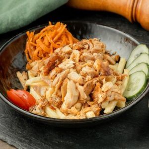Заказать Картофель фри, куриное филе, огурцы маринованные, огурцы, помидоры, морковь по-корейски, чесночный соус.