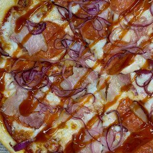 Заказать Соус томатный, салями, бекон, моцарелла, лук маринованный, соус барбекю, тесто.