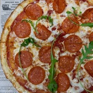 Заказать Соус томатный, салями, ветчина, грибы, моцарелла, лук маринованный, масло чесночное, тесто.