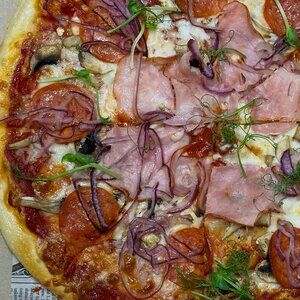 Заказать Соус томатный, салями, ветчина, грибы, моцарелла, лук маринованный, масло чесночное, тесто.