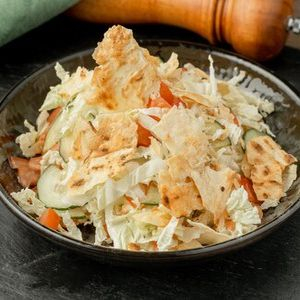 Пекинская капуста, огурец свежий, помидоры, шарики из измельчённого нута, чесночный соус.
