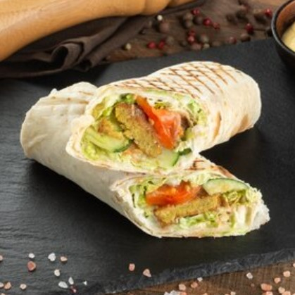 Заказать Лаваш, шарики из измельчённого нута, маринованные огурцы, свежие огурцы, помидоры, пекинская капуста, чесночный соус.