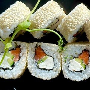 Рис, нори, лосось, сыр сливочный, огурец, кунжут.