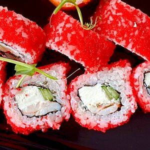 Заказать Рис, нори, сливочный сыр, огурец, креветки, икра масаго.